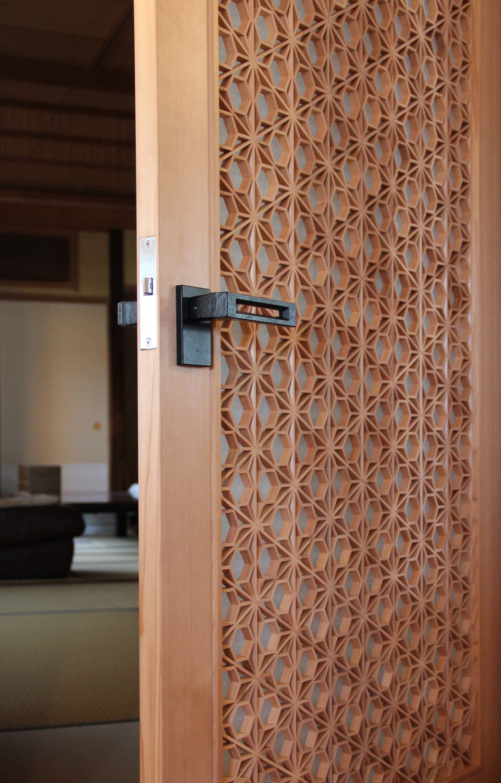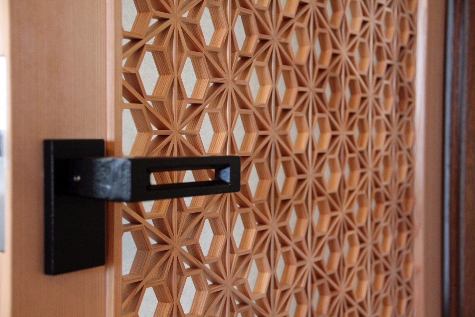 The pattern used here is one of the most time consuming designs we make. “Yae” means “many”, and the kumiko is very decorative with many features, gorgeously lighting the room.