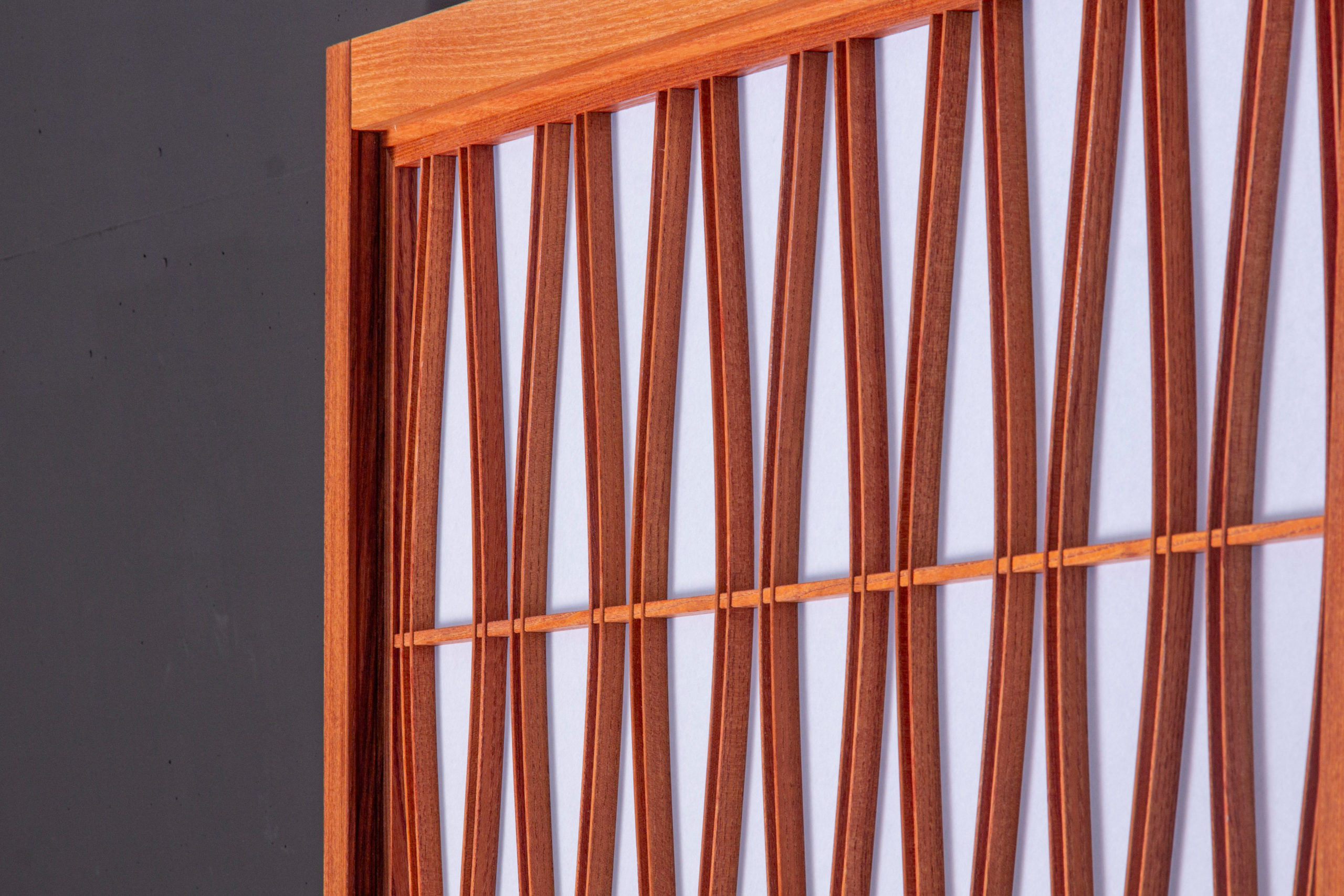 そよ風に揺れる草花の線をモチーフにした紋様です。 風を表す流線文様は古くから屏風や襖絵にも描かれ、清らかな気配を室内に招くしつらえとして親しまれています。木のしなやかさを生かした緩やかな曲がりで流線を描き、繊細で軽やかな動きの表情に仕立てました。 さりげない季節感と、やわらかな趣を備えたデザインです。