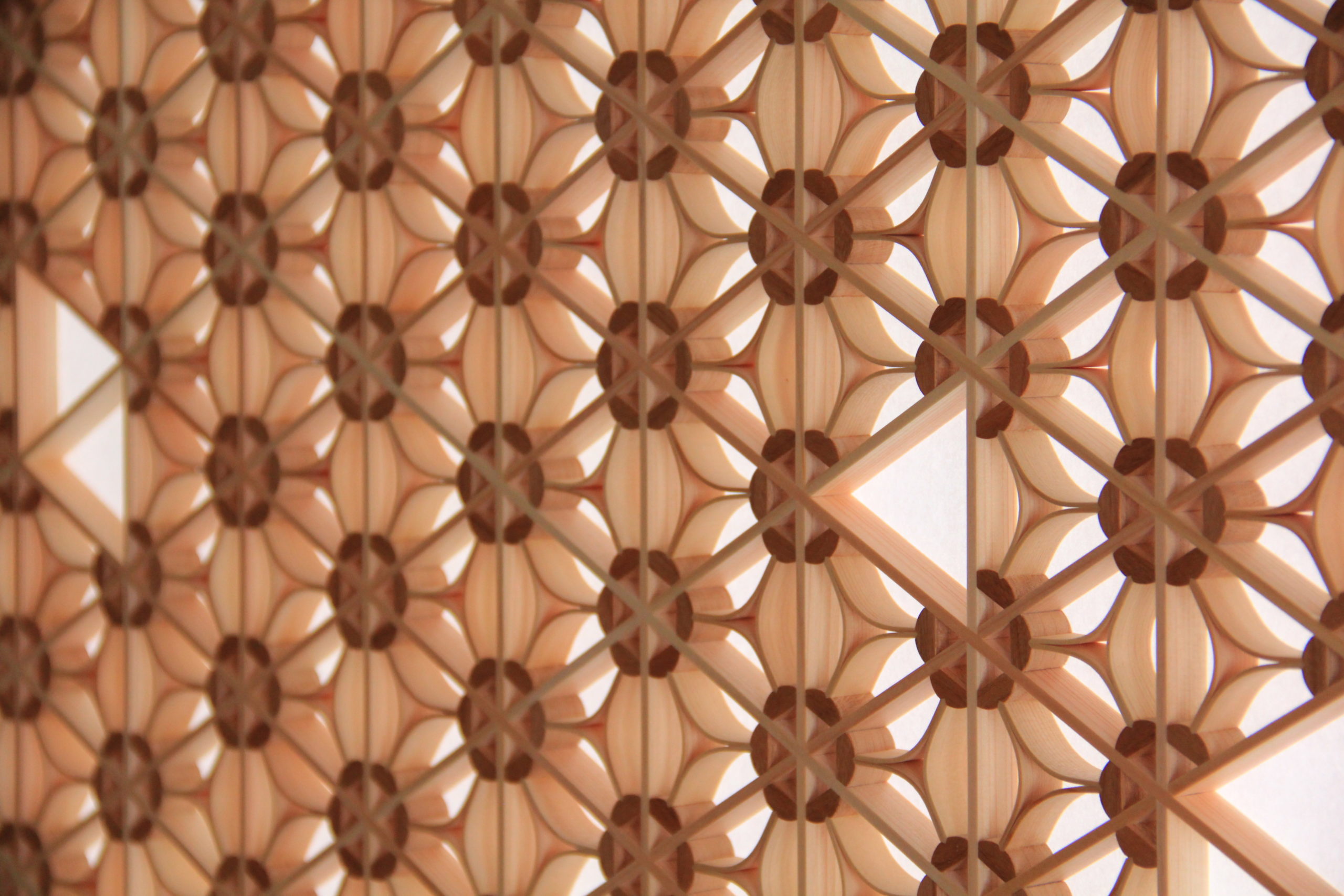 日本の花として愛好される桜は大変人気があり、組子にもさまざまな意匠で描かれています。 吉原ではアクセントとして芯に色が異なる材を使用し、丸みのあるぷっくりとした可愛らしい桜花にアレンジしました。お花が好きな方にお勧めしたいデザインです。中の曲げ木細工は七宝と言われ、人と人との縁が円満に広がる様として描かれています。