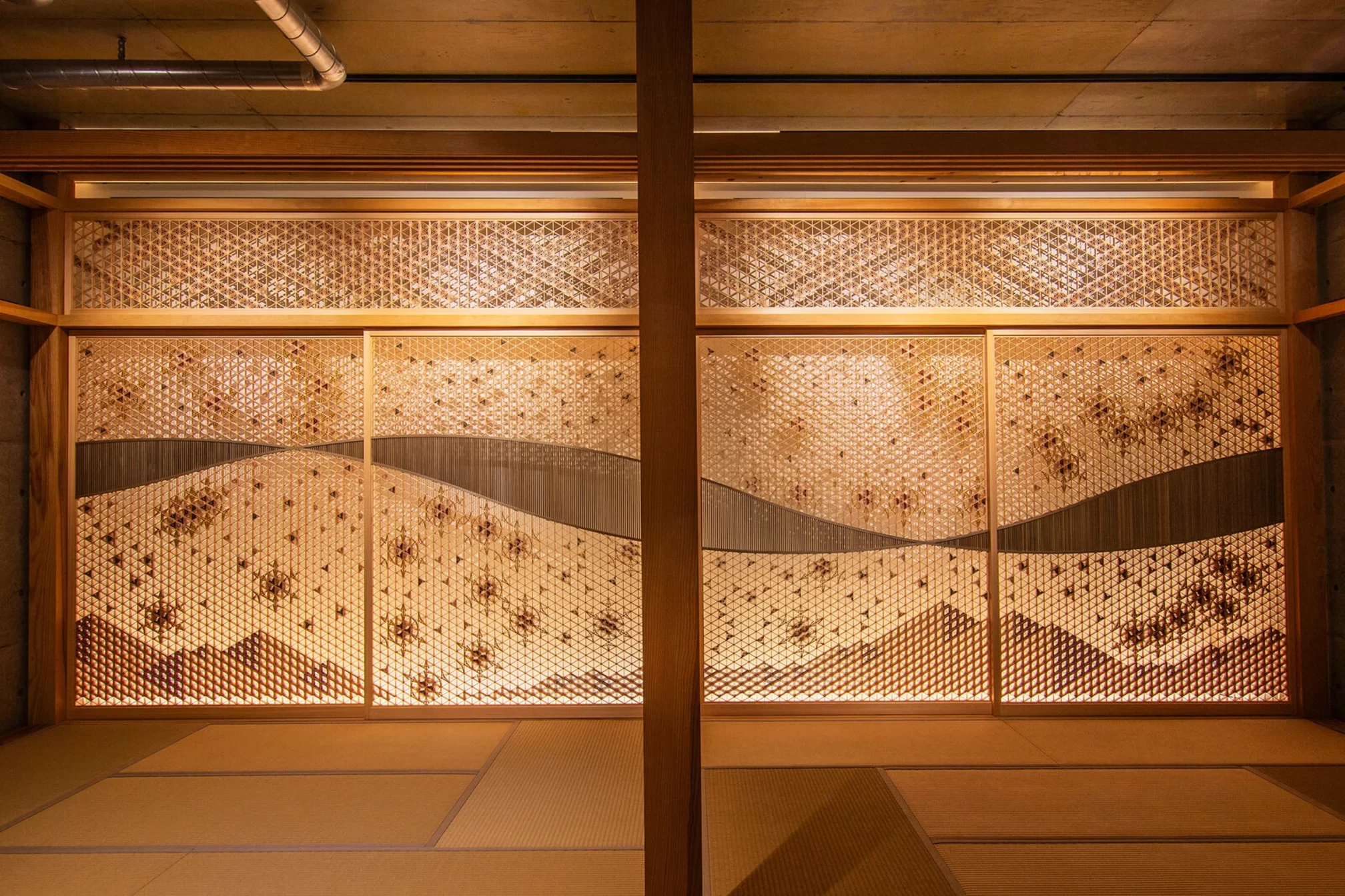 どちらの空間にとっても主役となる、両面に組子を施した贅沢な建具です。中央にアクリルを挟むことで空調効率にも優れます。組子が二重になるためコストは通常の倍になりますが、表裏どちらからも美しい意匠を楽しめます。