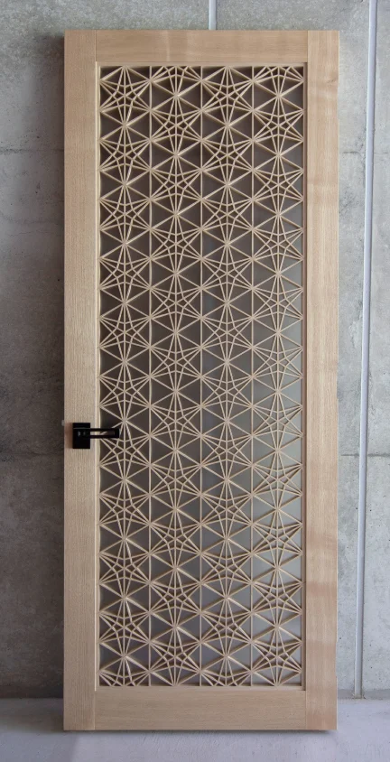 開き戸にも、さまざまなデザインで組子を取り入れることができます。重厚な一枚板のドアや、突板を使用したシンプルなタイプにも組子が映え、取手や金物を工夫することで、玄関や室内に美しく調和します。
