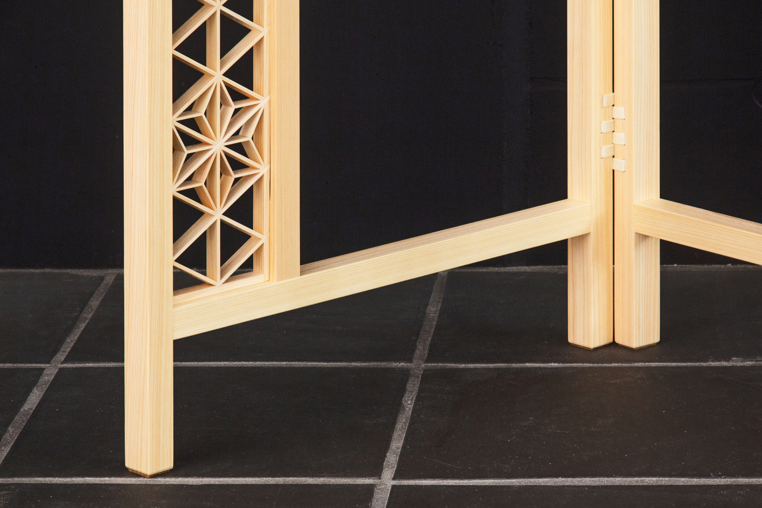 国産檜と山桜を用い、建具職人が伝統的なホゾ組みで丁寧に仕上げた衣類ラックです。紐蝶番を編み込むことで、右勝手・左勝手のどちらにも折りたためる柔軟な設計としました。片面には吉原オリジナル「もみじ」の組子を配し、葉が舞い落ちる情景を表現。やさしい木の気配が暮らしに寄り添い、空間にほどよい存在感をもたらす“魅せるラック”です。 |