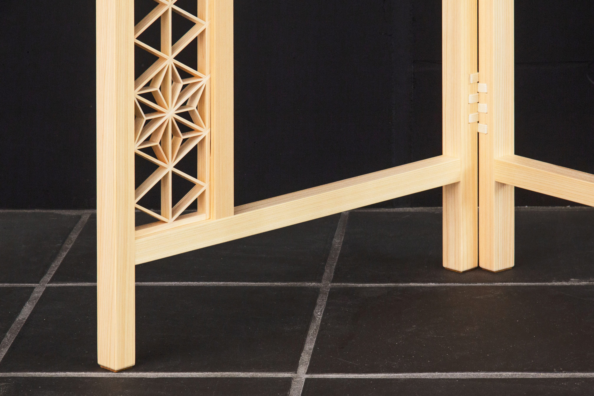 国産檜と山桜を用い、建具職人が伝統的なホゾ組みで丁寧に仕上げた衣類ラックです。紐蝶番を編み込むことで、右勝手・左勝手のどちらにも折りたためる柔軟な設計としました。片面には吉原オリジナル「もみじ」の組子を配し、葉が舞い落ちる情景を表現。やさしい木の気配が暮らしに寄り添い、空間にほどよい存在感をもたらす“魅せるラック”です。 |