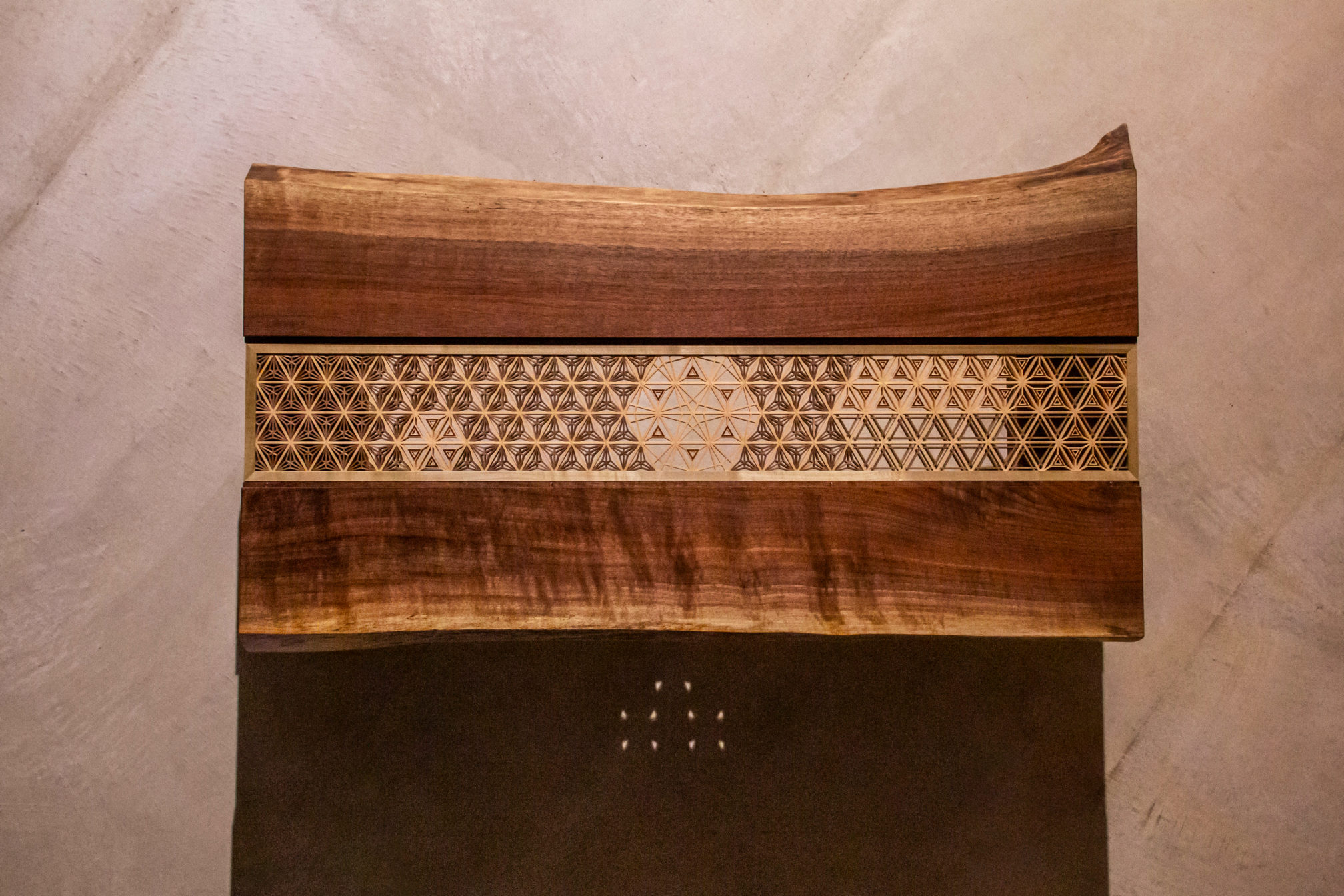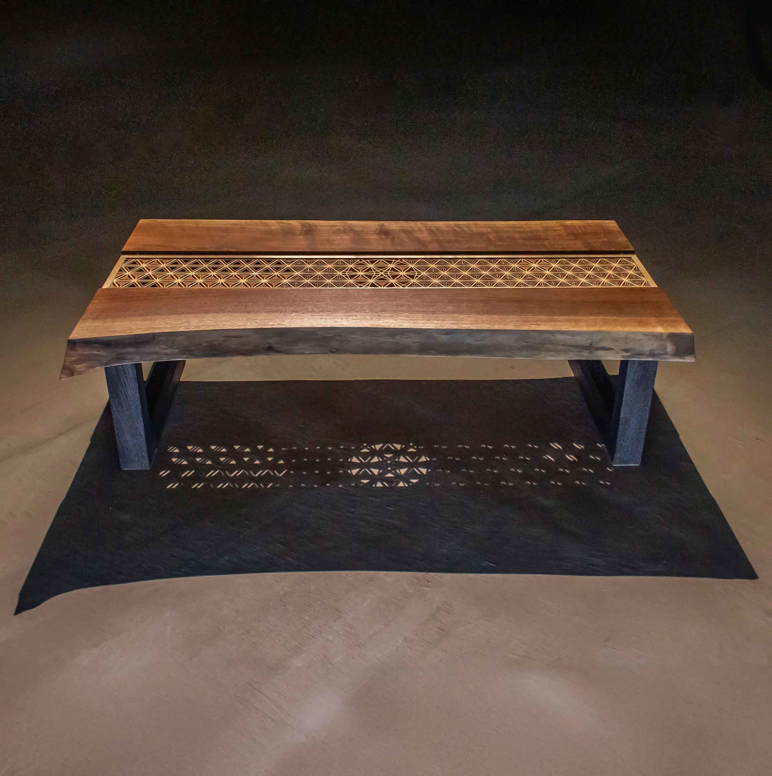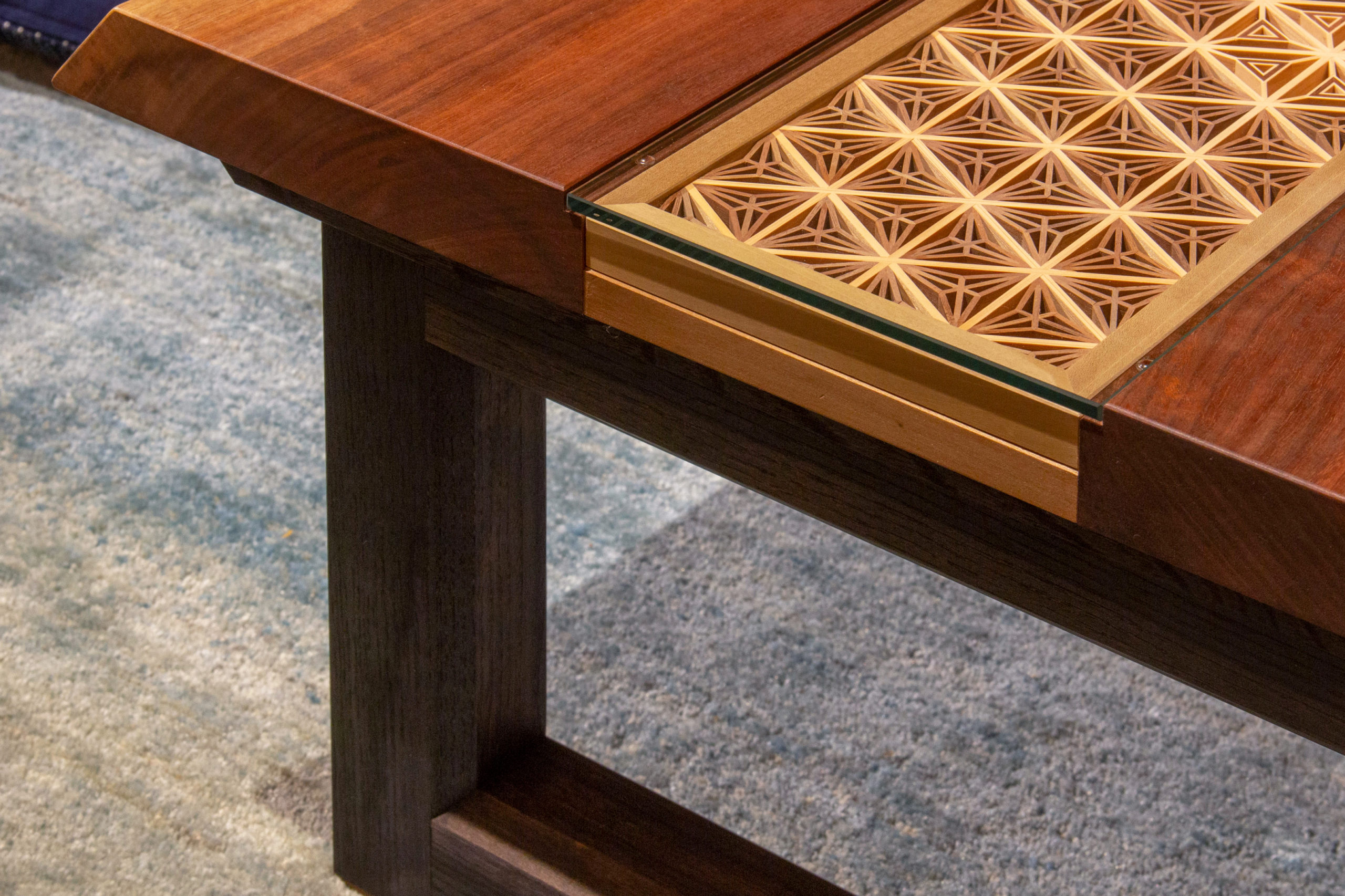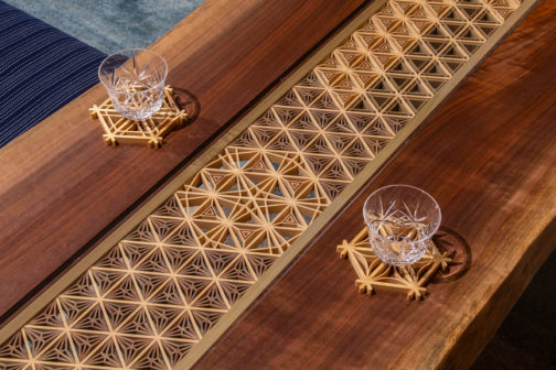 | 材料 | 天板:ウォルナット / 脚部:栗+鉄水 / 組子:国産檜 朴⽊ ウォルナット パドック |