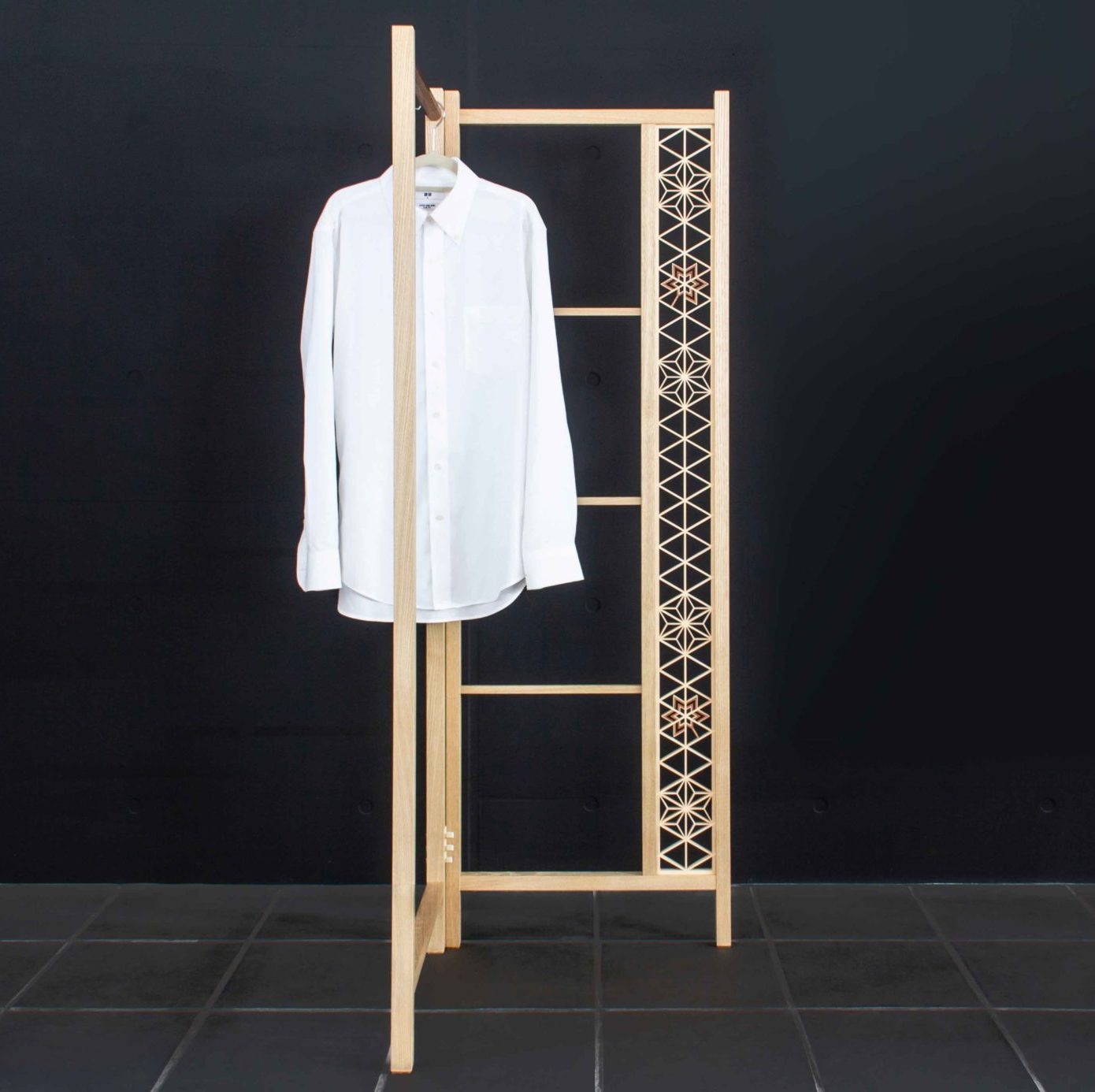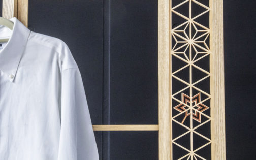 国産栗とウォルナットを用い、建具職人が伝統的なホゾ組みで丁寧に仕上げた衣類ラックです。紐蝶番を編み込むことで、右勝手・左勝手のどちらにも折りたためる柔軟な設計としました。片面には吉原オリジナル「もみじ」の組子を配し、葉が舞い落ちる情景を表現。やさしい木の気配が暮らしに寄り添い、空間にほどよい存在感をもたらす“魅せるラック”です。 |