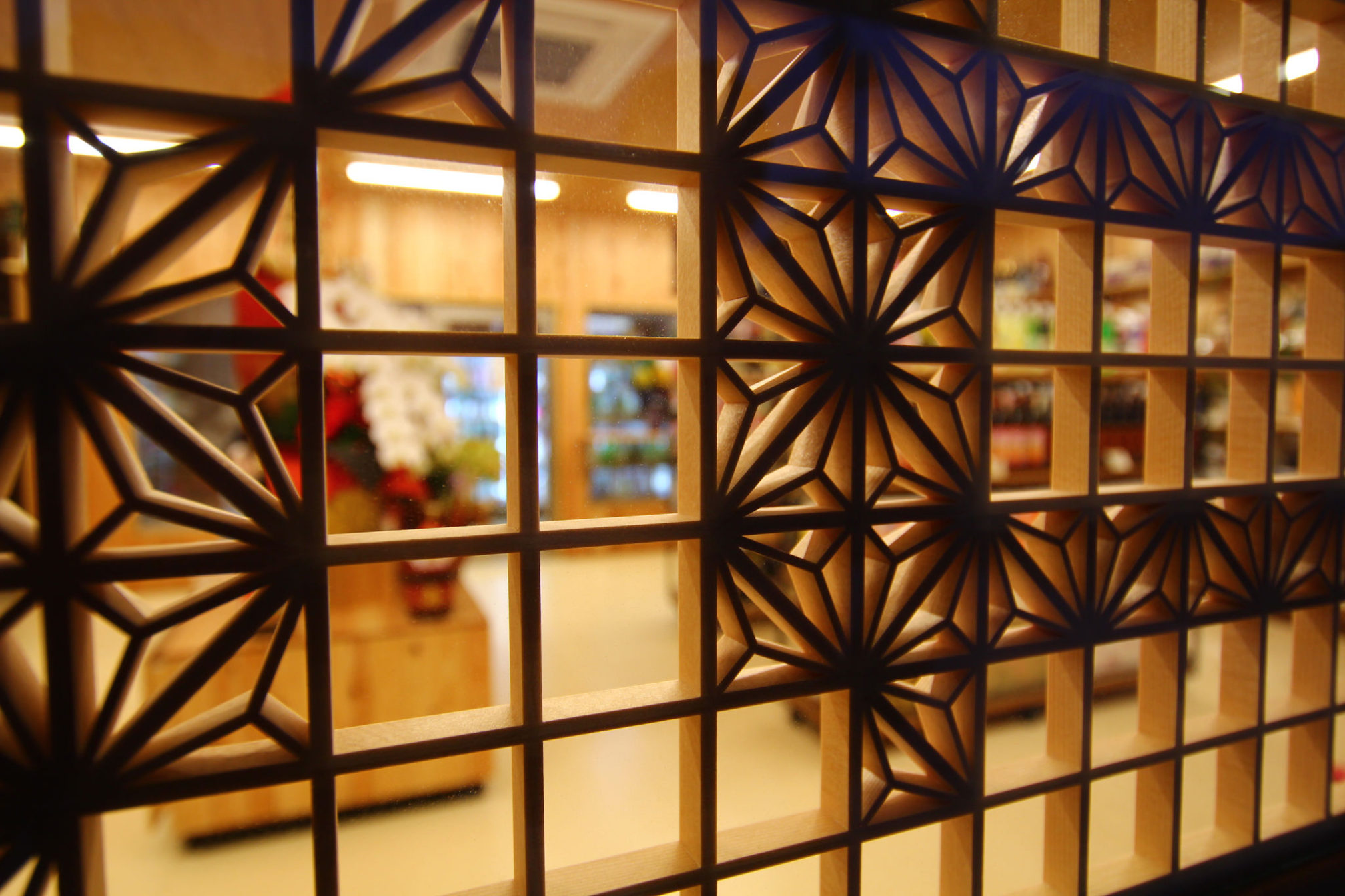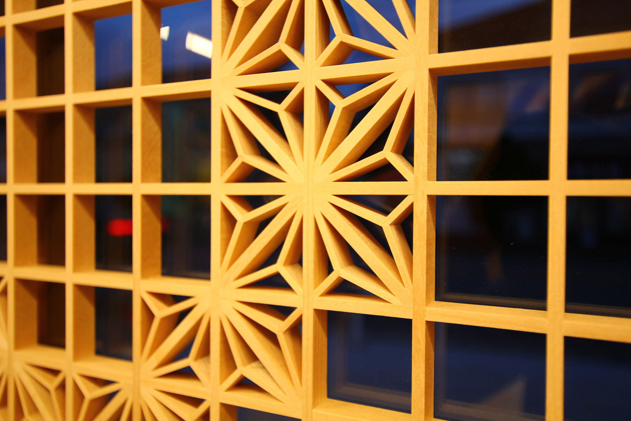 string(1026) "90度に交わる正方形の格子のなかに組み描く麻の葉を「角麻(かくあさ)」と言います。伝統的な書院障子にしばしば見られ、ポピュラーな組子細工として知られています。直線や市松模様などテトリスのようなおもしろい表現ができるのも角麻の魅力です。