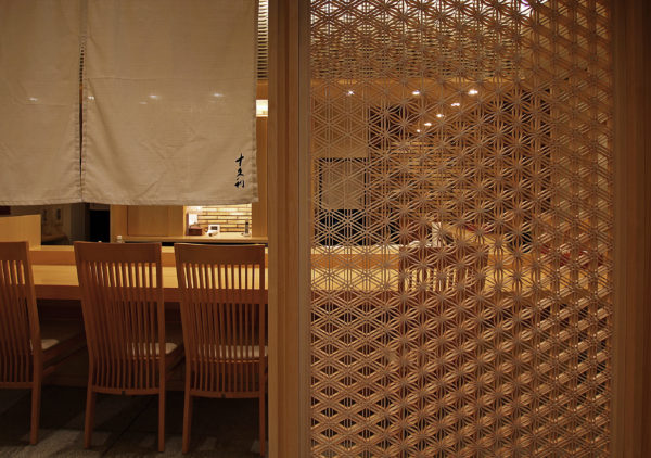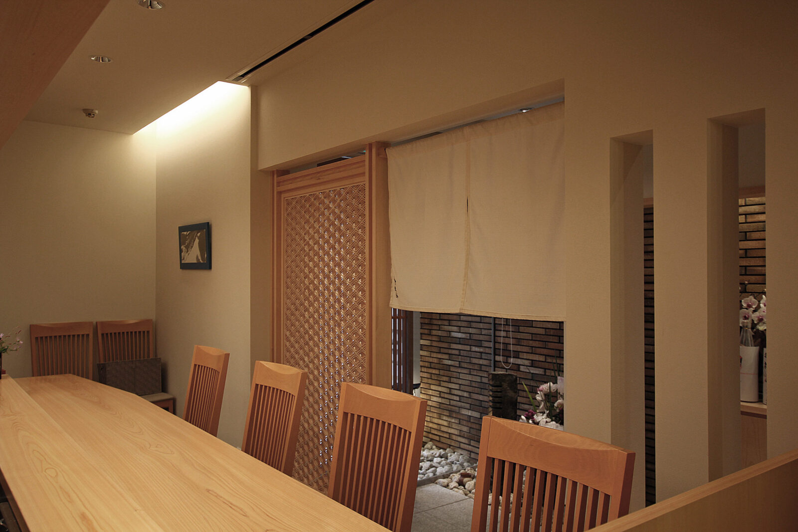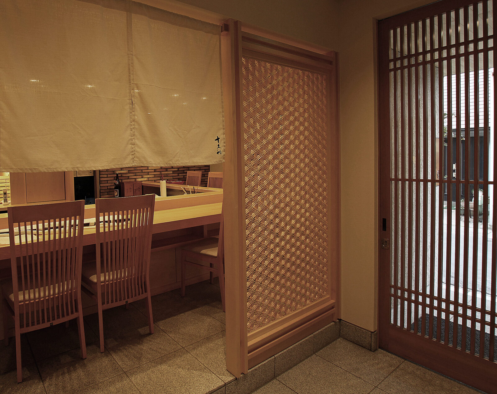 カウンターや吊り戸棚といった作り付け家具はオーナー様こだわりの総檜づくり。エントランスには重厚な伝統組子のパーティションなど、吉原木工所の製品がふんだんに取り入れられました。