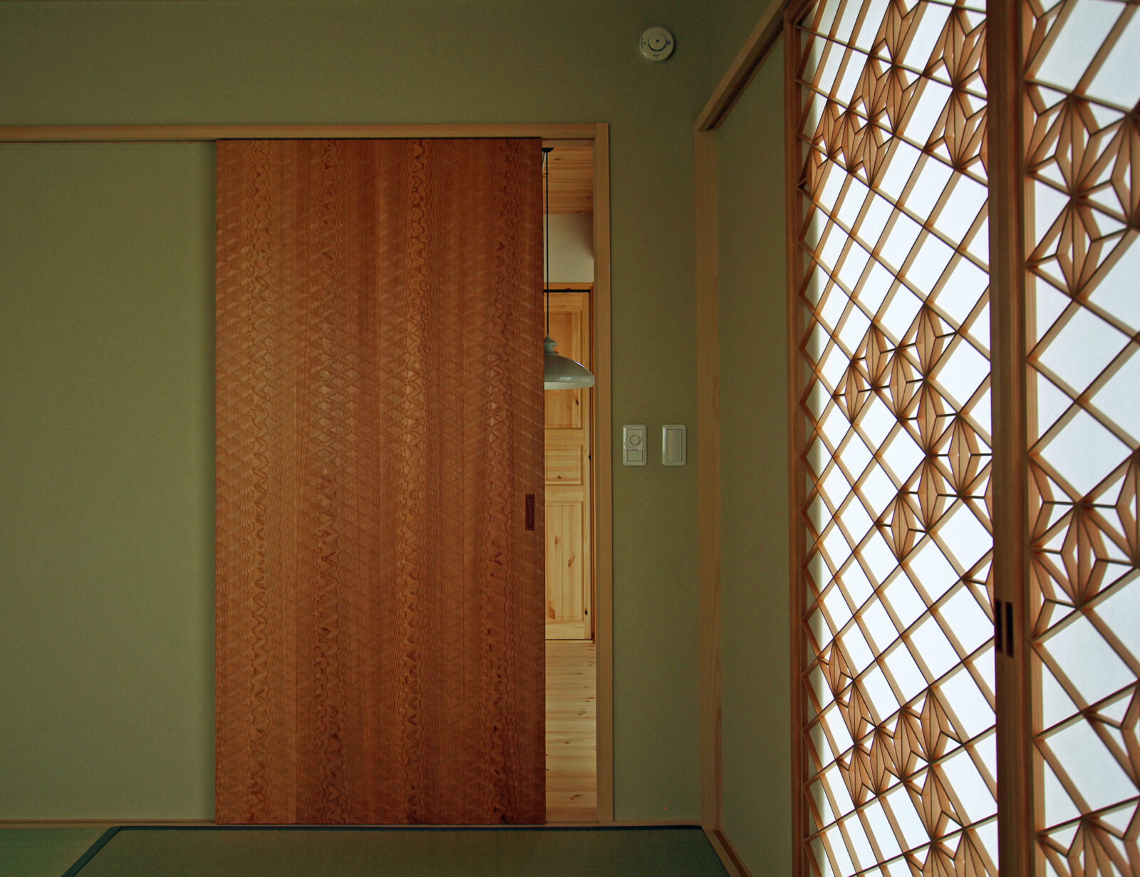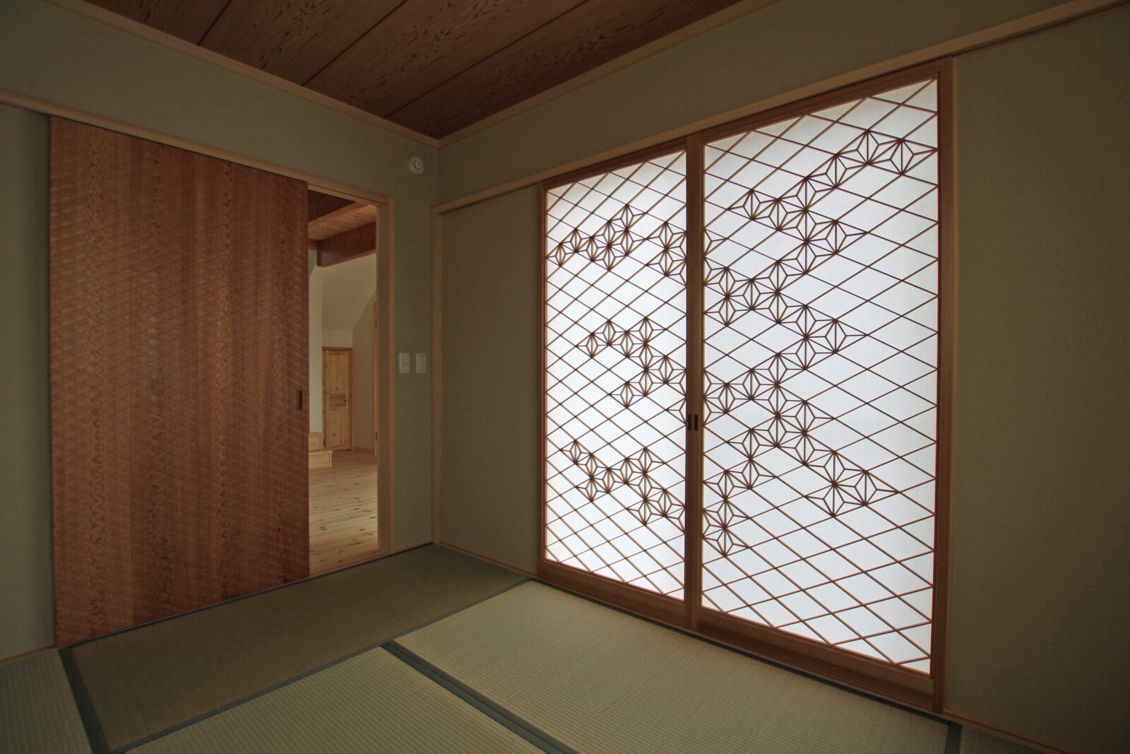 麻の葉がところどころ抜けていることでリズムを生み出す「破れ麻の葉」。着物に描かれる文様には古くから在るデザインですが、このイメージをリビング障子として制作させていただいたのは今回が初めてです。とても気に入っていただきました。