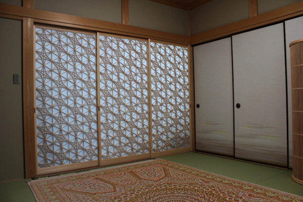築3年ほどのまだまだ新しいお家ですが、組子の装飾性に一目ぼれされたお客様のご意向で建具リフォームです。もともと戸襖がたっていたところにリビング障子を制作させていただきました。