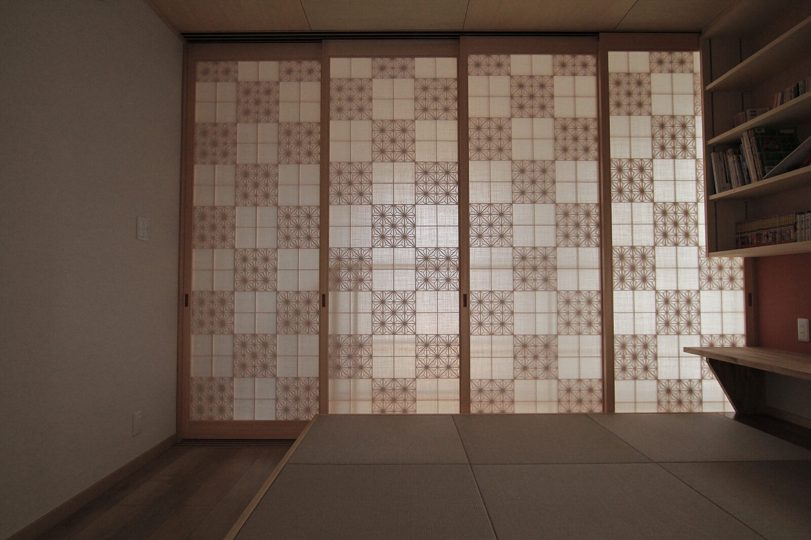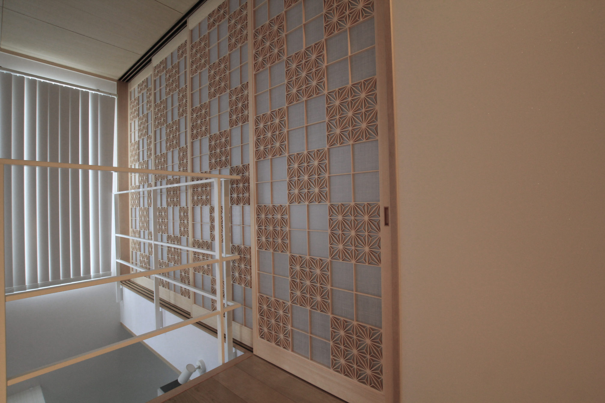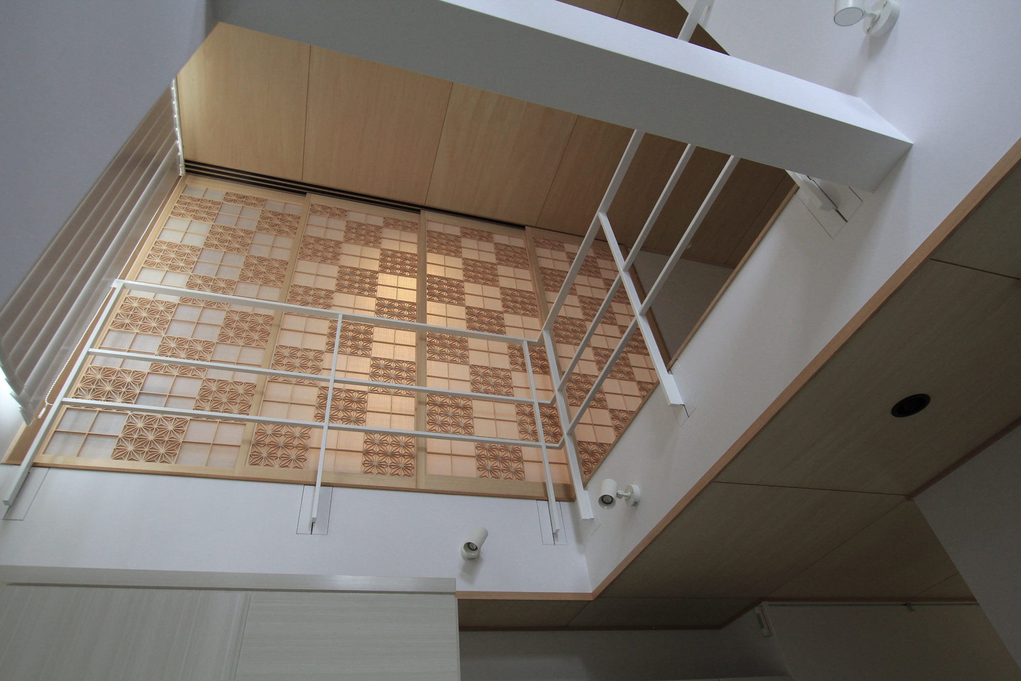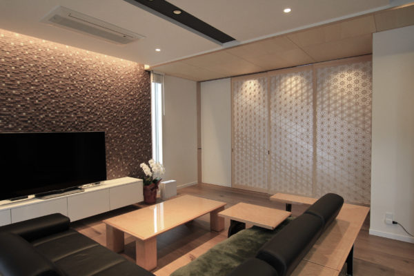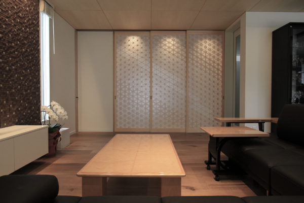 玄関を入ると吹き抜けになっており、二階からの市松模様が来客をお迎えします。照明を効果的に合わせることで陰影が深くなり、空間を艶やかな印象に仕上げます。和室に限らず、これほどモダンな佇まいにも和柄がマッチするということを改めて感じました。